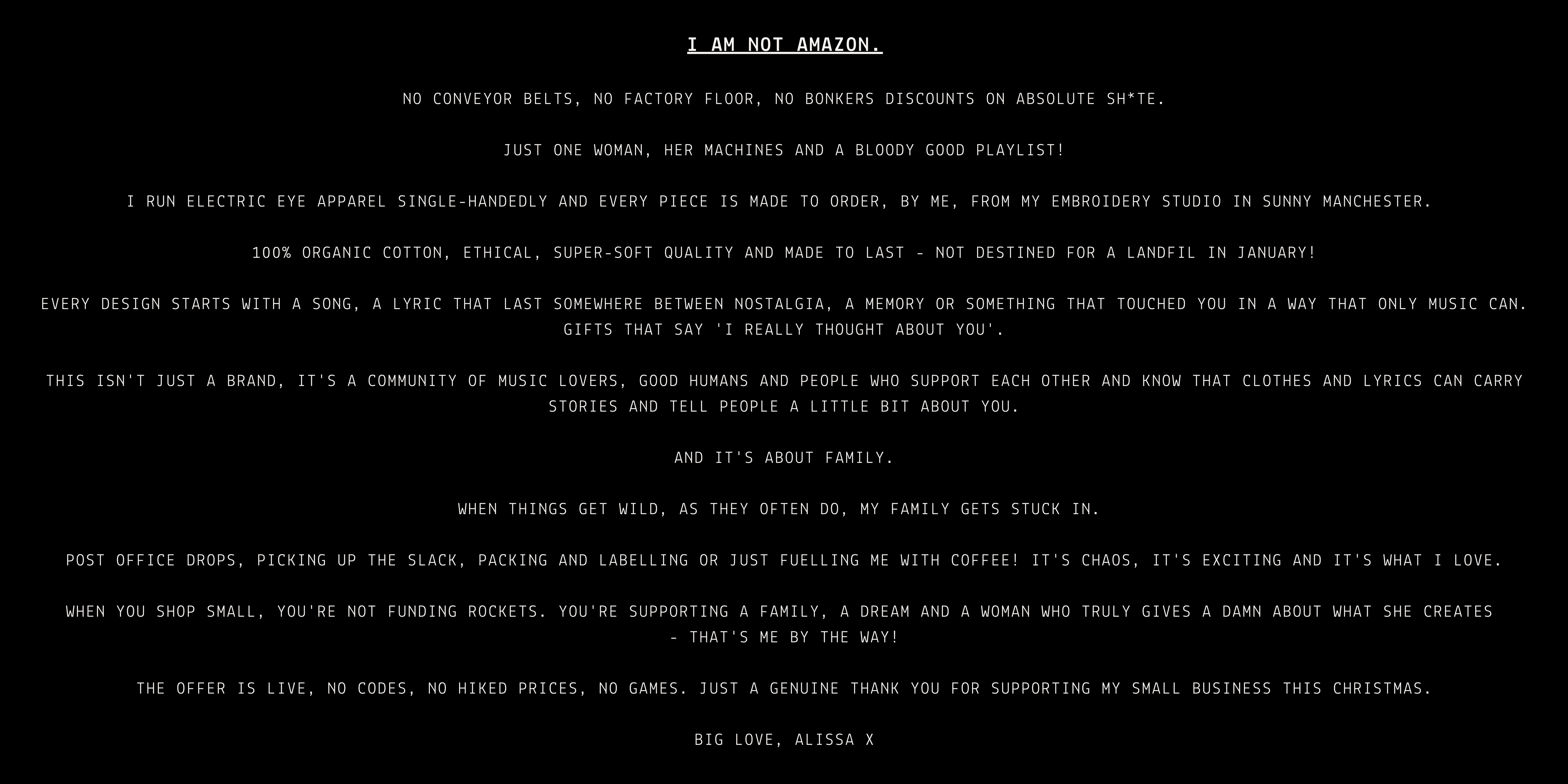 Electric Eye Apparel is a proud indie brand and every product is lovingly made to order from our studio in Manchester.