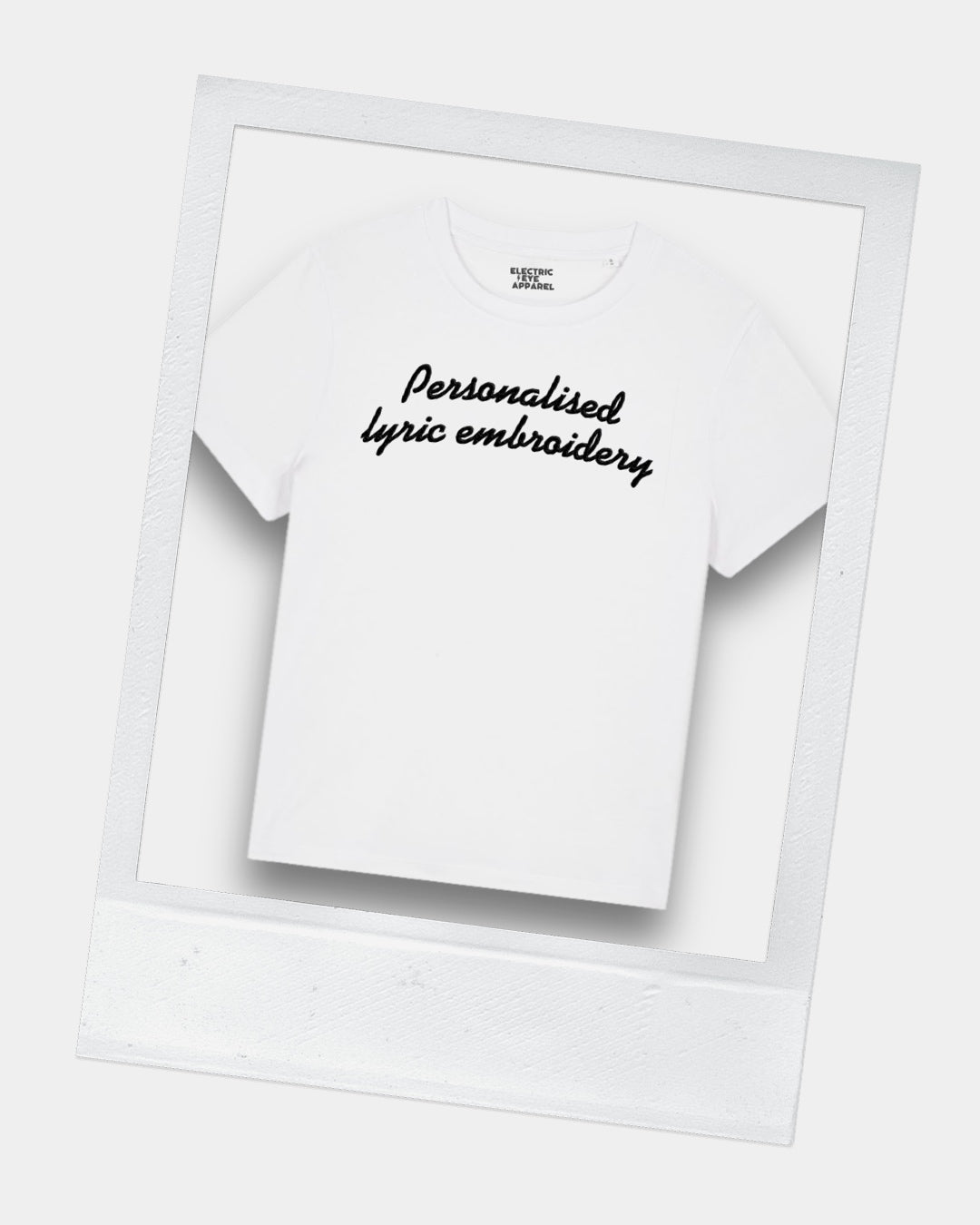 My wife cried when she opened her anniversary present (our second 'cotton' anniversary) . I had this t-shirt embroidered with the lyrics of our first dance song 'baby i'm yours' . The t-shirt was really well made and the fabric was great . My wife commented on how soft it was . You've gained two new fans in my wife and I .